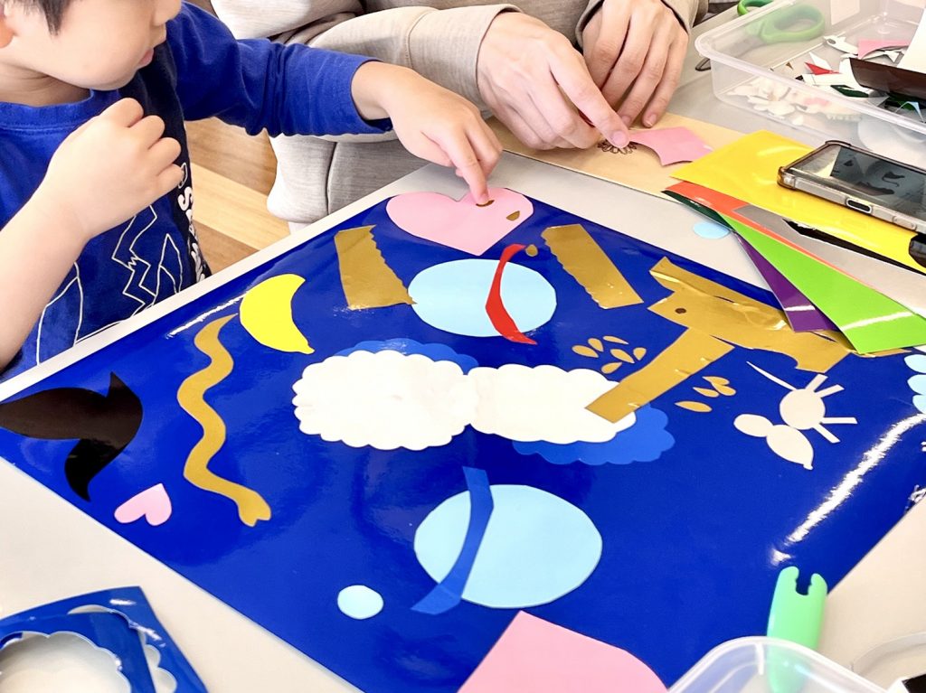カラフルなシールを切り貼りして作った絵で、はるみらいの壁を飾りましょう。できた作品は「第2回晴海まつり(2024年11月22日)」当日に、はるみらい館内でご覧になれます。