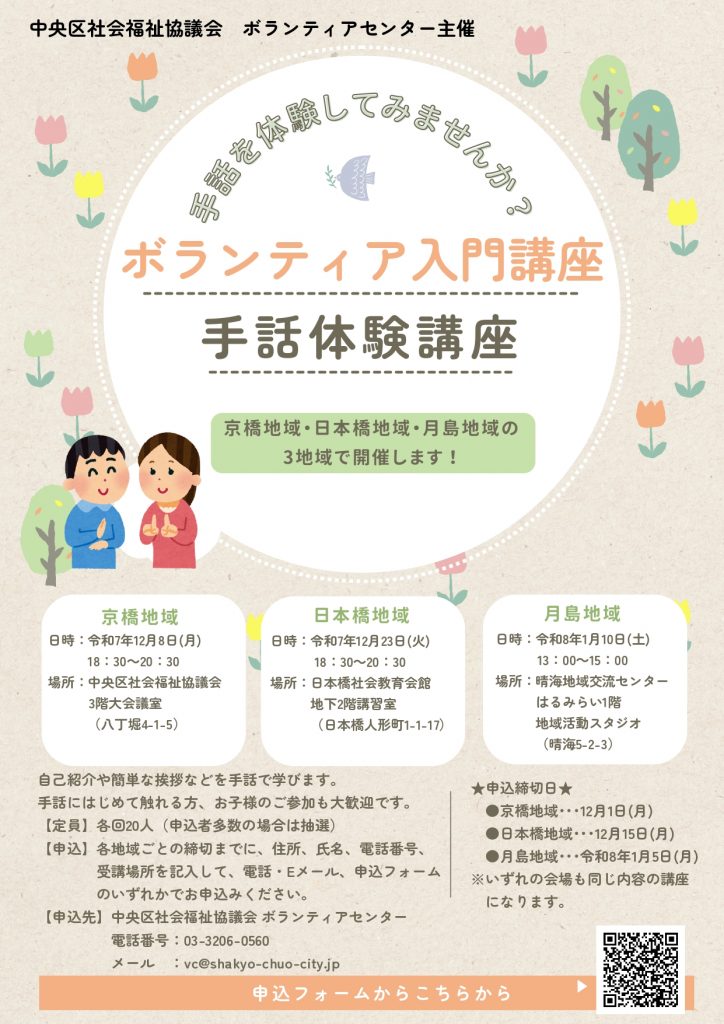【地域活動スタジオ】ボランティア入門講座「手話体験講座」(1月10日)のご案内 2025.11.18 1月10日(土)13:00~15:00 1F 地域活動スタジオにて、ボランティア入門講座「手話体験講座」を開催いたします。詳細は添付チラシにてご確認いただけます。 一覧へもどる