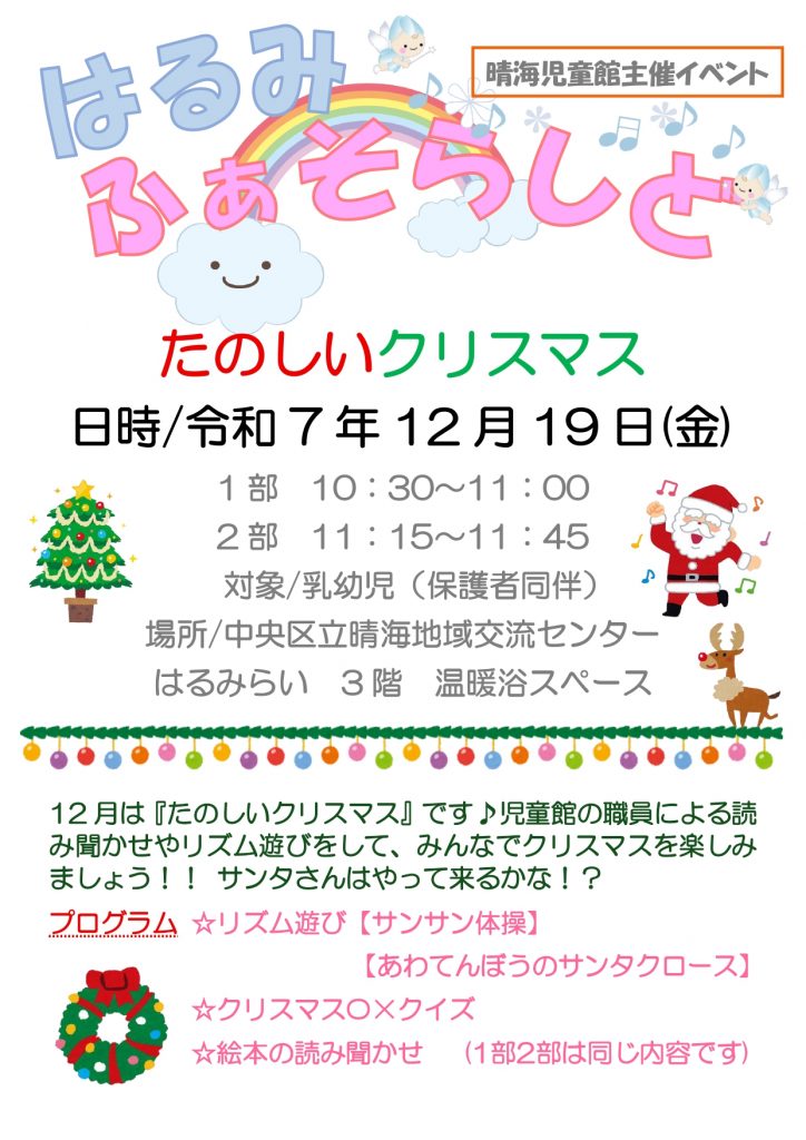 【12月19日(金)】晴海児童館主催イベント「はるみふぁそらしど」たのしいクリスマス